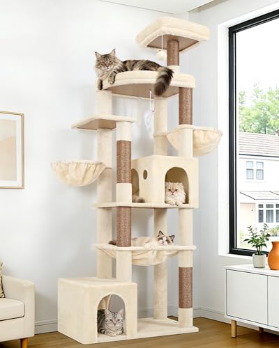 Globlazer Arbre a Chat Grand Hauteur 178 cm avec Doux Hamac, 2 Grandes Niches, Plateforme, Pente Sisal Peluche, Jouets, Arbres à Chat Coin Solide pour Gros Chats Repos Jeu Escalade (F70 Pro, Beige)