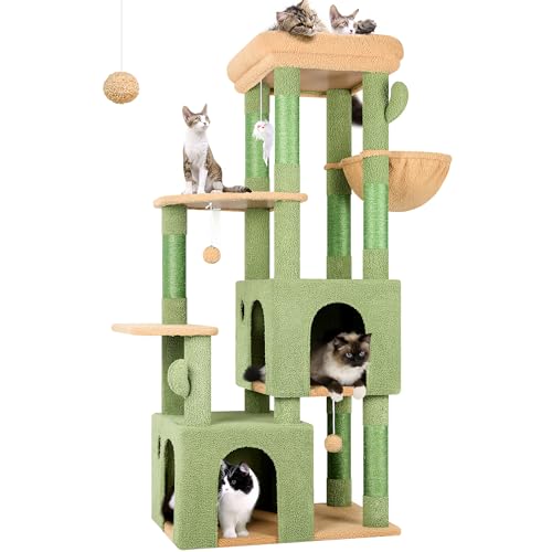 Globlazer Arbre à Chat Vert Cactus avec 2 Grande Niches, Doux Plate-Forme, Griffoirs en Sisal, Arbre a Chat Stable Haut 156 cm avec Grandes Bases Tronc épais pour Gros Chats Chaton (F61, Vert)