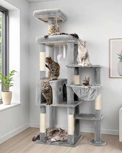 Globlazer Arbre a Chat Grand Hauteur 178 cm avec Doux Hamac, Grandes Niches, Plateforme, Pente Sisal Peluche, Jouets, Arbres à Chat Coin Solide pour Gros Chats Repos Jeu Escalade (F70 Pro, Gris Clair)
