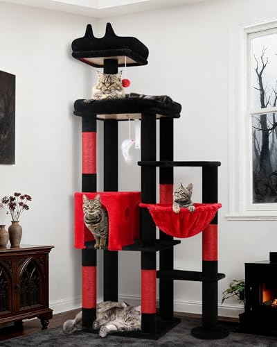 Globlazer Arbre à Chat Gothique Noir Rouge avec 2 Grande Niches, Doux Plate-Forme, Griffoirs en Sisal, Arbre a Chat Stable Haut 156 cm avec Grandes Bases Tronc épais pour Gros Chats (F61, Gothique)