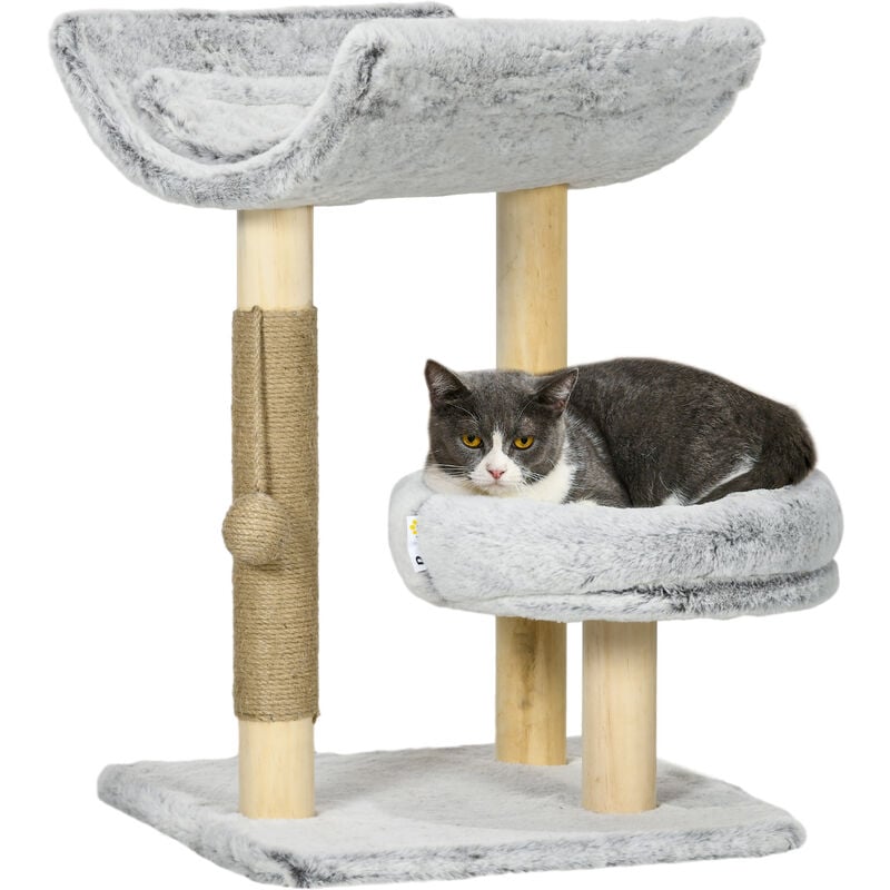 Pawhut - Arbre à chat griffoir chanvre naturel panier plateforme d'observation jeu boule suspendue bois panneaux peluche gris