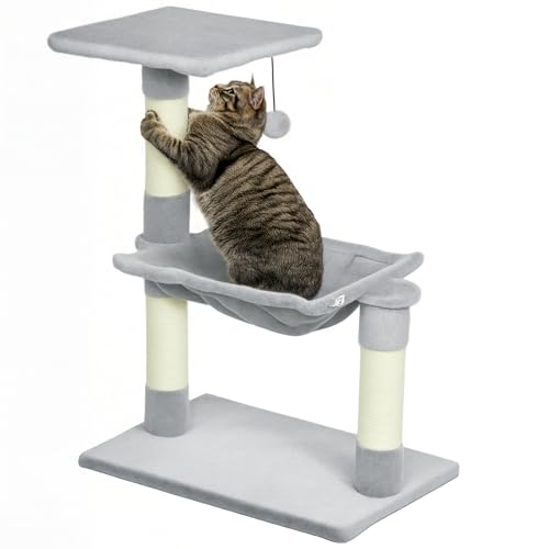 PawHut Arbre à Chat 3 griffoirs grattoirs sisal Naturel Plateforme hamac et Boule Suspendue dim. 50L x 26l x 70H cm Peluche Courte Gris Clair