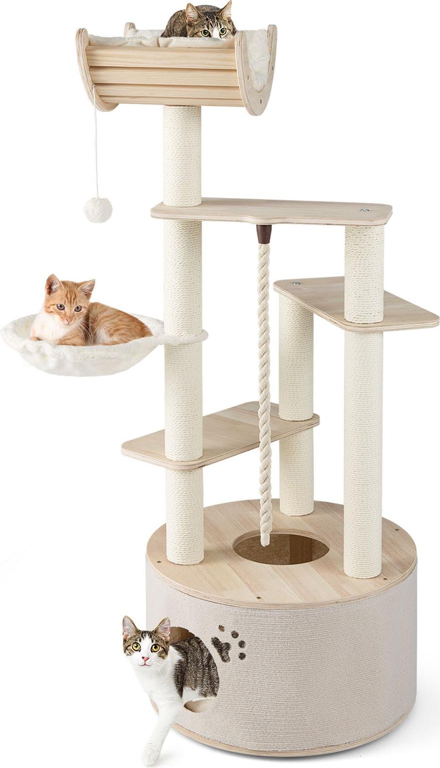 Arbre à chat COSTWAY en bois, 141 cm, arbre à chat avec grande niche, hamac, poteaux à griffer en sisal, balle et plateformes, tronc épais, arbre à grimper naturel
