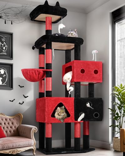 Globlazer Arbre à Chat Gothique Noir Rouge Grand XXL Hauteur 204 cm avec 3 Perchoirs, 2 Niches, 2 Paniers, Hamac, Arbres a Chats Stable pour 3-5 Chats Adulte Repos Jeu Gratter (F80, Gothique)