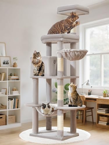 Taoqimiao Arbre a Chat XXL Grand Format,183cm Stable Arbre à Chat Maine Coon avec Condos Spacieux pour Chats, 5 Griffers, Très Grand Plateformes, Hamac, Panier pour Matou, MS045G Gris Fumée