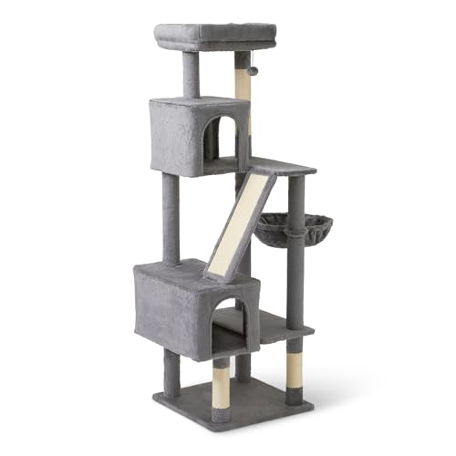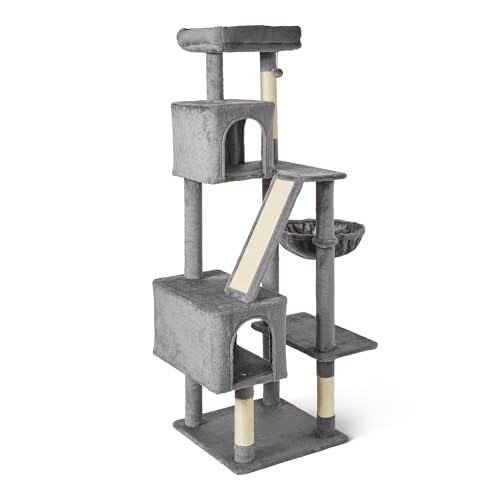 Amazon Basics Arbre à Chat pour Chats d’Intérieur, Tour Multi-Niveaux, Niche avec Griffoir, Hamac Confortable et Perchoirs pour Chats Adultes, Balle Suspendue Interactive, Taille L, 152,7cm (H), Gris