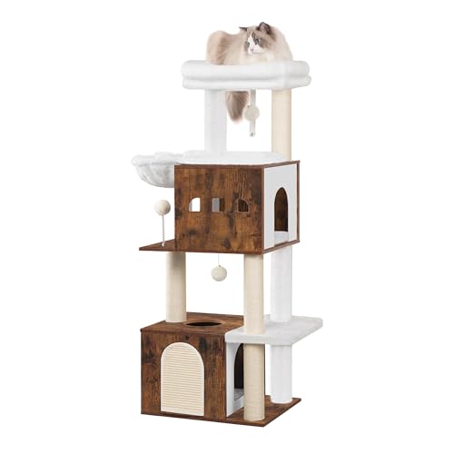 Hzuaneri 130 cm Arbre a Chat, Arbre a Chat Bois, Grande Plateforme, 2 Niches, 4 Griffoirs, Hamac, 3 Pompons, Marron Rétro MS13201WT