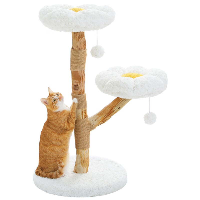 Pawz Road - Arbre à Chat Moderne 92 cm avec Poteaux en Poirier Naturel, 2 Perchoirs Fleuris Doux & Pompon Suspendu, Blanc