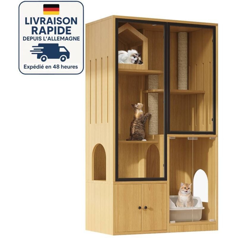 PAWZ Road Arbre à Chat Moderne en Bois avec Armoire de Rangement, bac à litière et Niche spacieuse, Grand perchoir et hamac, poteaux à gratter recouverts de sisal pour Chats
