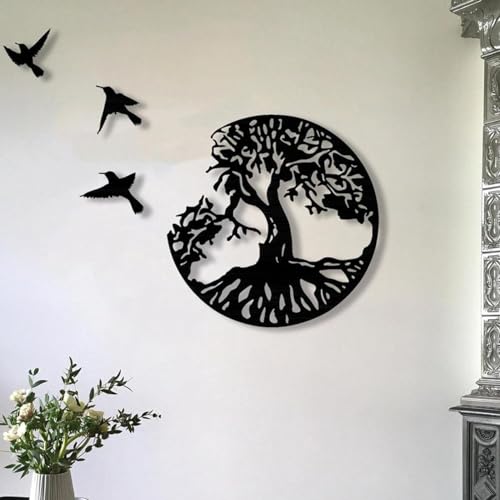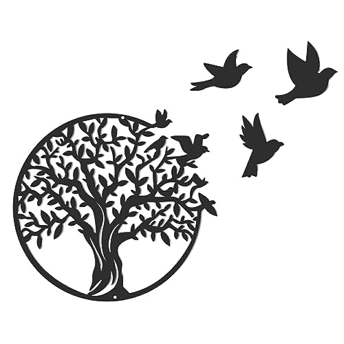 11,8" Art Mural Arbre de Vie Noir en Métal - Sculpture Murale 3 Oiseaux Volants,pour Cadeau Intérieur Cadeau Extérieur Jardin Maison Décoration,11.8 * 11.8in