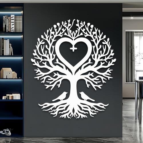 Décoration Murale Arbre de Vie en métal Blanc, Cœur décoratif en métal, Sculpture Moderne Arbre de Vie pour Salon, Chambre, Couloir et escalier, Décoration intérieure Nature (Blanc 48 cm)