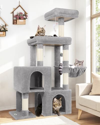 Globlazer Arbre a Chat 137 cm avec Très Gros Hamac 45 * 40cm, Grand Niches, Plateforme Rembourrés, Facile à Installer Arbres à Chats Intérieur pour Chats Adulte Repos Jeu Gratter (F53, Gris Clair)