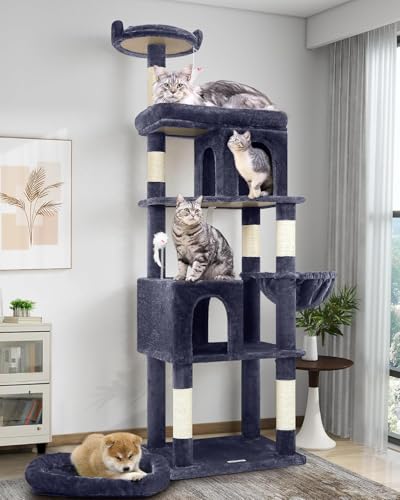 Globlazer Arbre a Chat pour 2-4 Chat avec 3 Grandes Niches 40 * 33 * 35cm, Plateforme, Planche Sisal, Panier, Peluche Jouets, Stable Arbres à Chats Hauteur 167 cm pour Gros Chats (F52B, Gris Foncé)