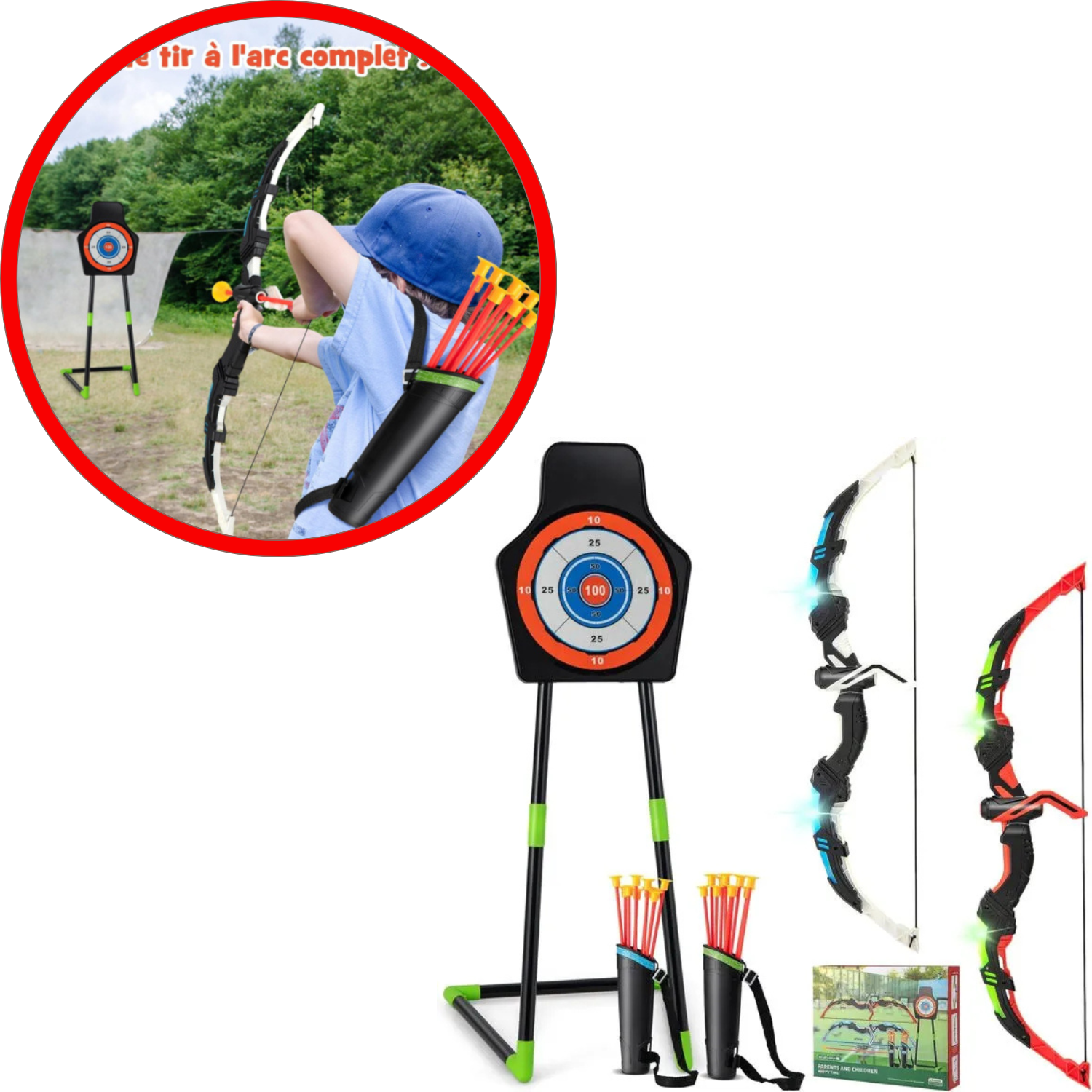 COSTWAY arc et flèche enfant : 2 arcs, 20 flèches ventouse, cible, feux...