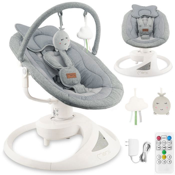 MoMi PEARL - Balancelle bébé électrique 360° - 5 vitesses 10 mélodies Bluetooth - Dossier réglable - Arche à jouets - Gris