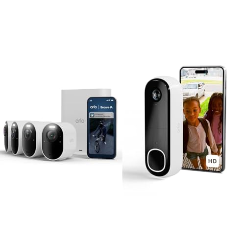 Arlo Ultra 3 et Sonnette, Caméra de Surveillance WiFi Extérieure sans Fil 4K, Détection par IA, Vision Nocturne Couleur, Compatible avec Alexa, Essai Secure Inclus, 4 Caméras + Smarthub
