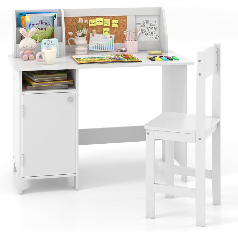 Goplus - Bureau pour Enfants avec Chaise-90x45x86CM-1 Armoire à Porte+Bibliothèque Dessus+Tableau d'Affichage-Blanc