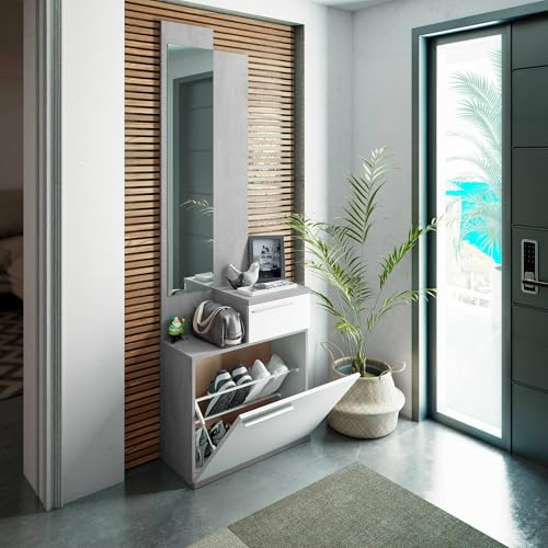 Dmora - Meuble d'entrée Waltham, Étagère à Chaussures Multifonction avec Miroir, Armoire avec 1 Porte et 1 tiroir, 61x28h185 cm, Ciment et Blanc Brillant