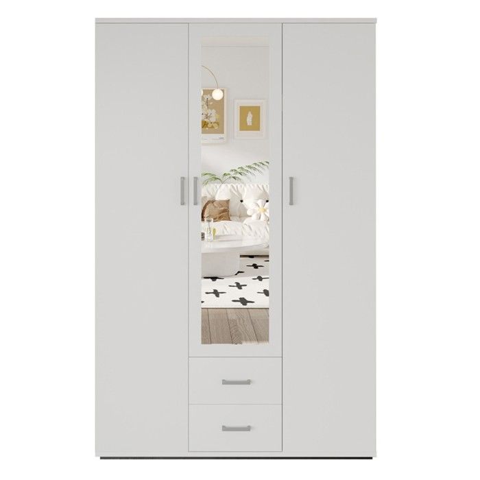 New Mexico Armoire 3 portes avec une porte miroir, 2 portes lambrissées et 3 tiroirs, en blanc ciré.