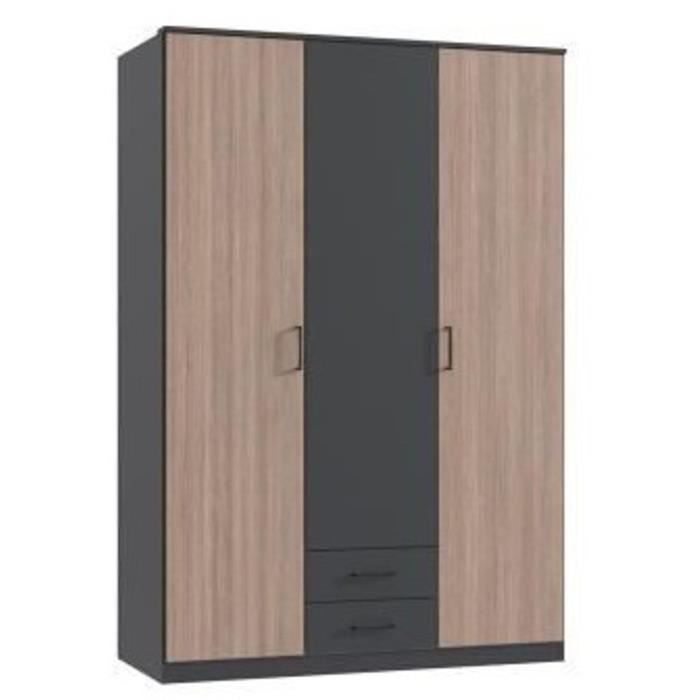 Armoire AGIA - 3 portes battantes + 2 tiroirs - Décor anthracite et chêne - L135 x H199 x P58 cm