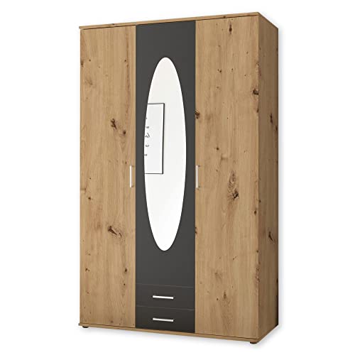Stella Trading Cassel Kassel Penderie Miroir Aspect chêne Artisan Graphite – Armoire Polyvalente 3 Portes pour Votre Chambre à Coucher, Bois d'ingénierie, 120 x 195 x 55 cm