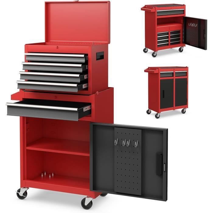 Boîte à outils à rouler avec tiroirs, Armoire de stockage d'outils en acier avec poignée, Roues verrouillables, Boîte d'organisateur d'outils pour atelier de garage (rouge noir,5 Tiroir)