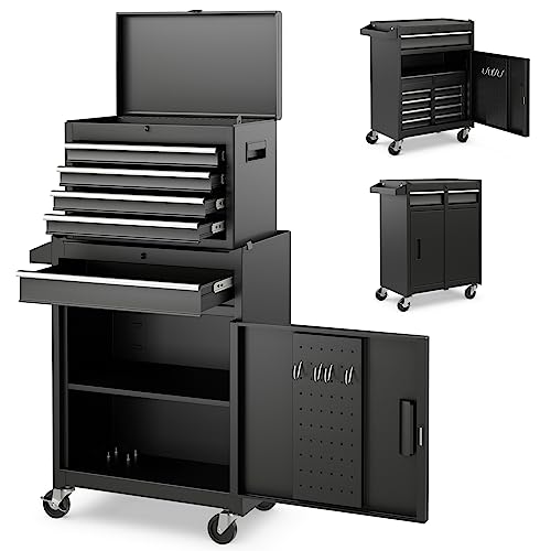 GOPLUS Servante d’Atelier avec Coffre Amovible, 28 x 59 x 102CM, Caisse à Outils Roulant avec 5 Tiroir Verrouillable & Armoire à Étagère Réglable, Poignée Latérale, pour Garage, Atelier(Noir)
