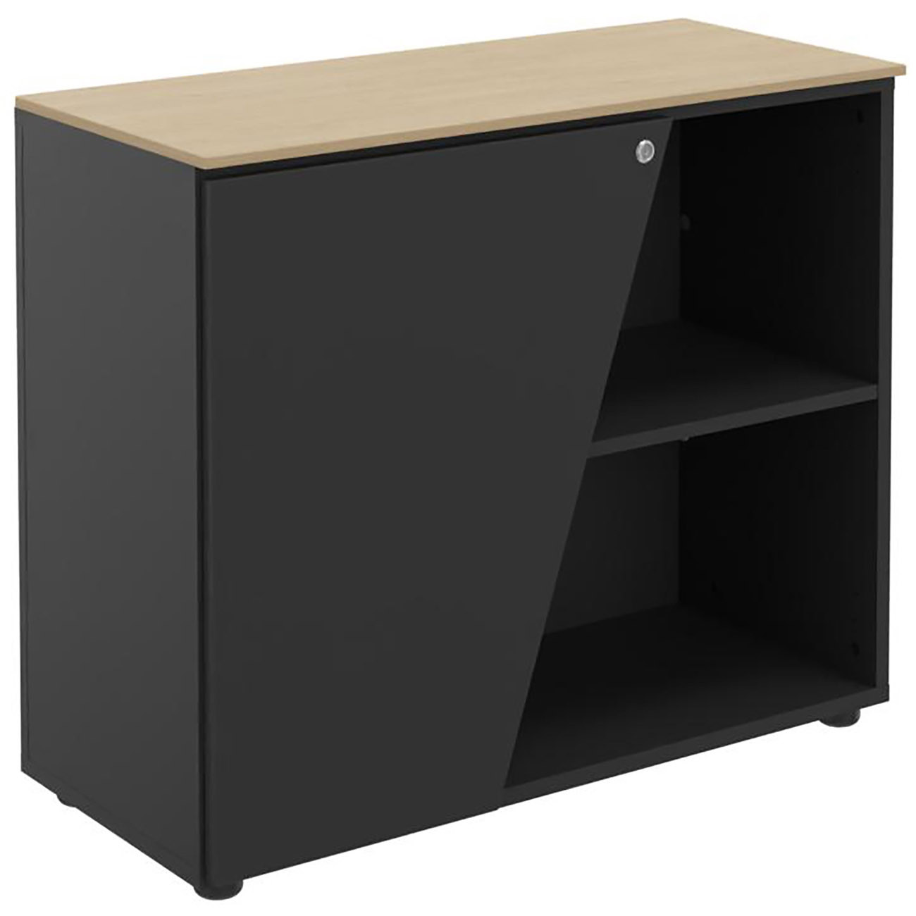 Armoire basse porte à gauche Rhéa - L. 90 x P. 40 x H. 76 cm - Plateau Chêne - Porte Carbone