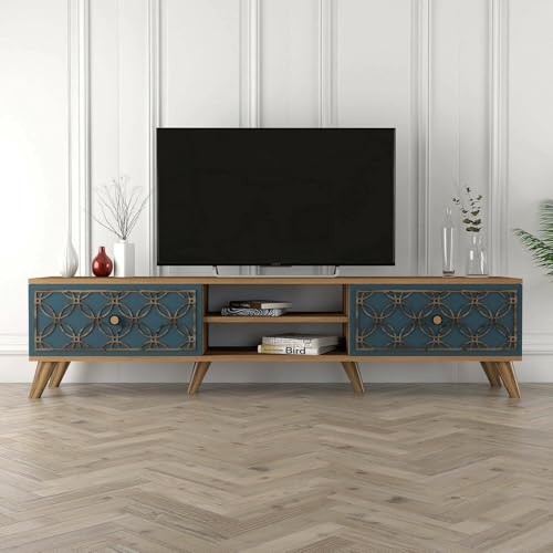Dmora - Meuble TV Atlux, Buffet de Salon, Armoire Basse pour TV, Base Murale de Rangement, 180x35 h44 cm, Noyer et Bleu