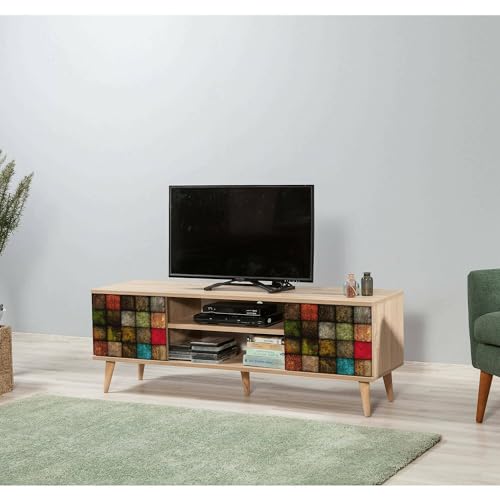Dmora - Meuble TV Amalthea, Buffet de Salon, Armoire Basse pour TV, Base Murale de Rangement, 140x40h50 cm, Chêne et Multicolore
