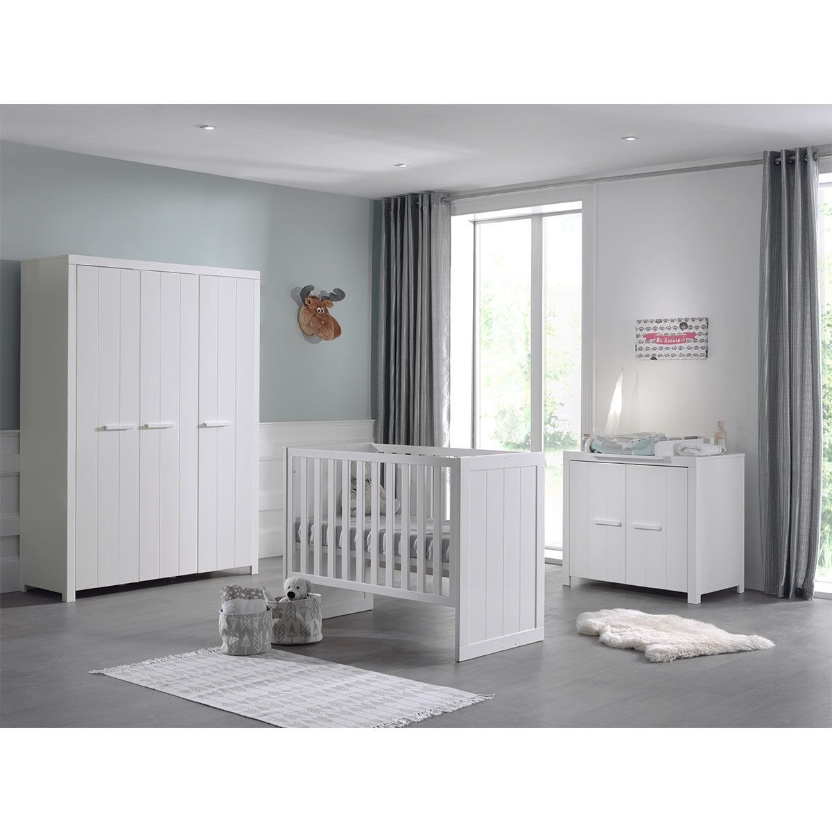 Chambre bébé 4 pièces lit commode plan à langer et armoire 3 portes bois laqué blanc et pin clair...