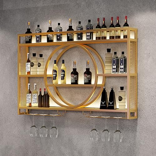 XDOPIRRS Armoire à vin en métal de grande capacité, casier à vin mural industriel avec lumières LED, présentoir à bouteilles de vin, avec porte-verres, casier à vin en bandes de fer(Gold,140cm)