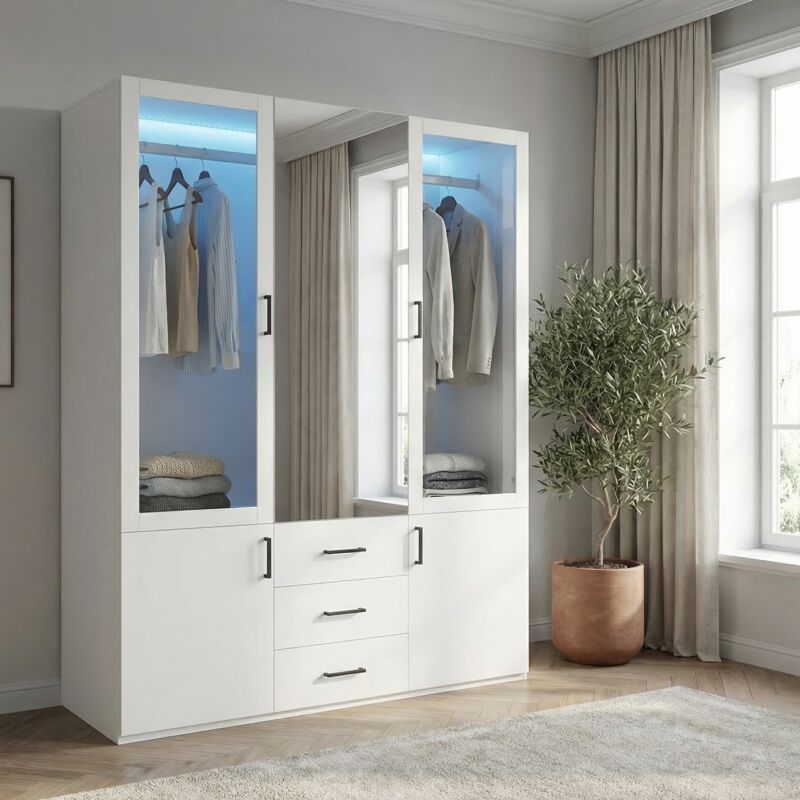 Grand armoire chambre moderne 160x50x180 cm, armoire adulte avec penderie, 4 portes en verre, LED, 2 portes en bois et 3 tiroirs de rangement,