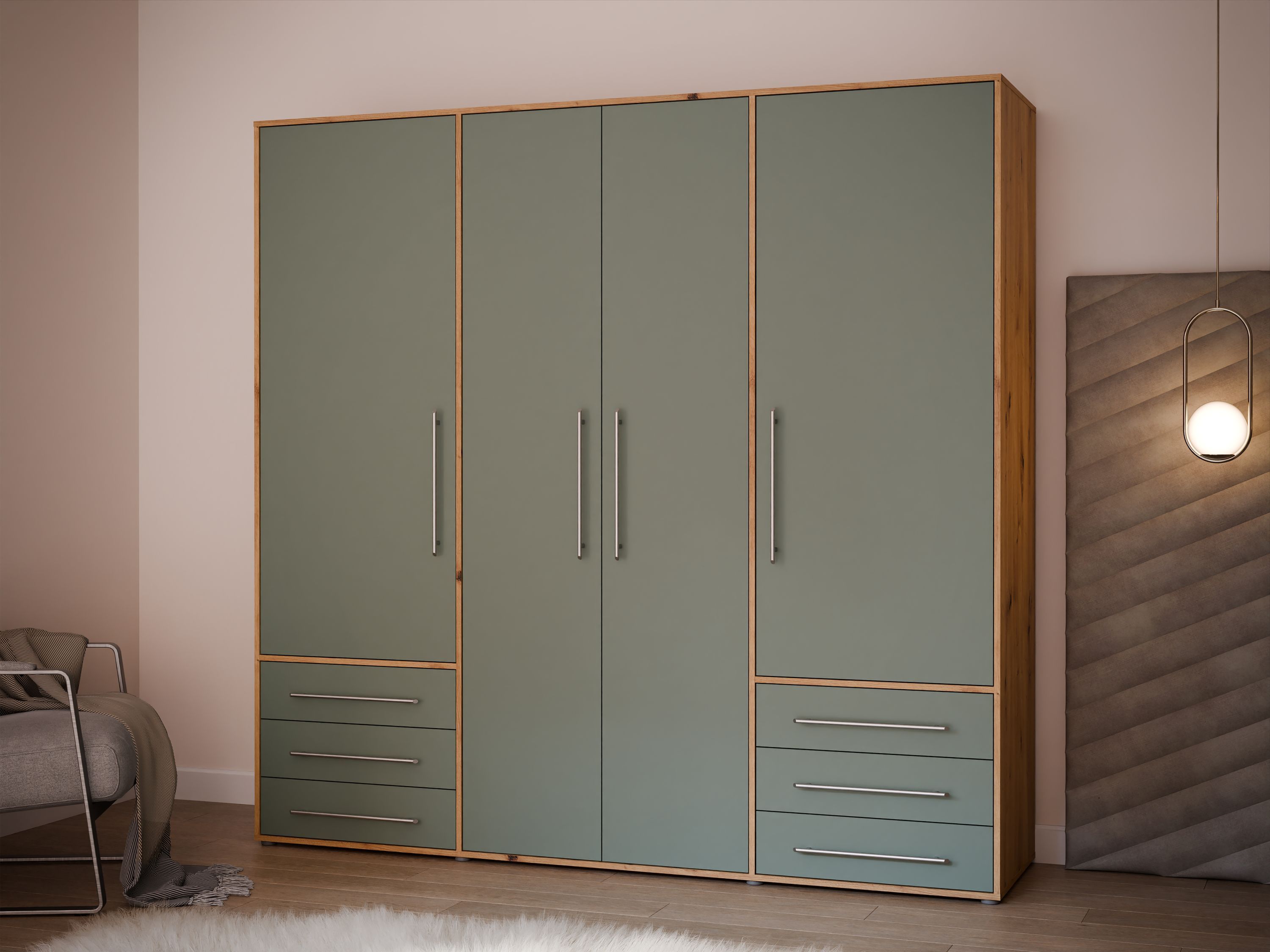 Armoire de chambre - MOKKARO - Décor Vert Sauge et chêne - 4 portes battantes - 6 tiroirs - L2059 x P53 x H200 cm