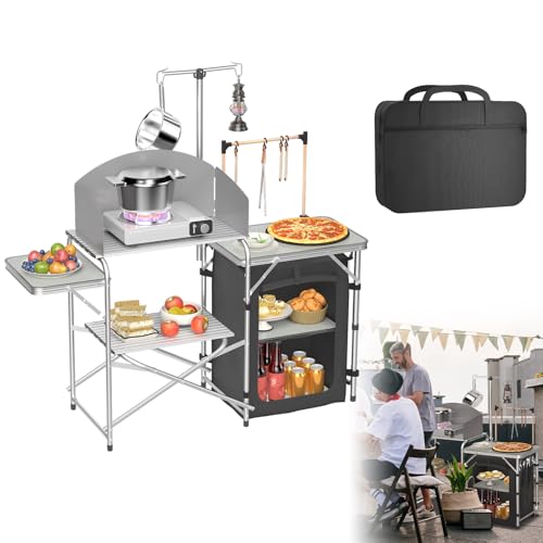 Ollewiellan Cuisine de camping avec sac de transport et pieds réglables en hauteur, armoire de camping avec 5 compartiments, pliable et légère pour le camping, les barbecues et les festivals