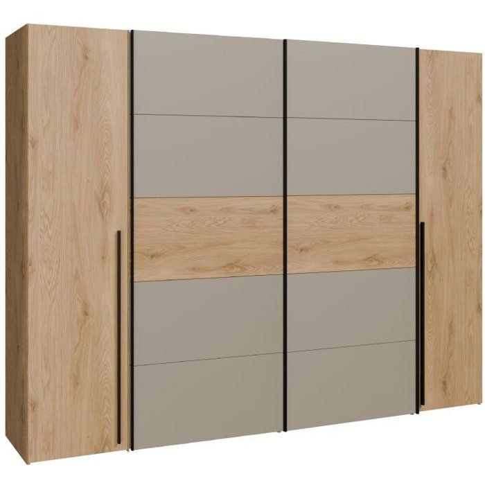 Armoire de chambre - NARAGO - Décor Chêne et Taupe - 2 portes coulissantes + 2 portes battantes - L270 x P61 x H210 cm