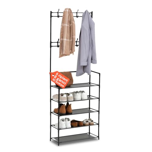 Avilia Porte-vêtements de sol avec double tige et étagère à chaussures à 5 étagères, support porte-vêtements en métal et TNT - Armoire ouverte pour entrée et chambre - Porte-manteau robuste et facile