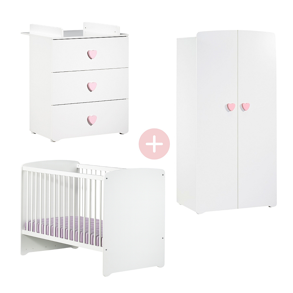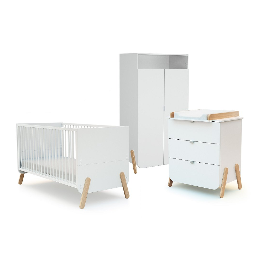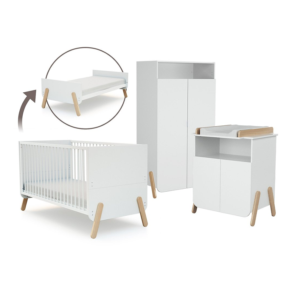 Chambre bébé 4 pièces lit commode plan à langer et armoire 3 portes bois laqué blanc et pin clair...
