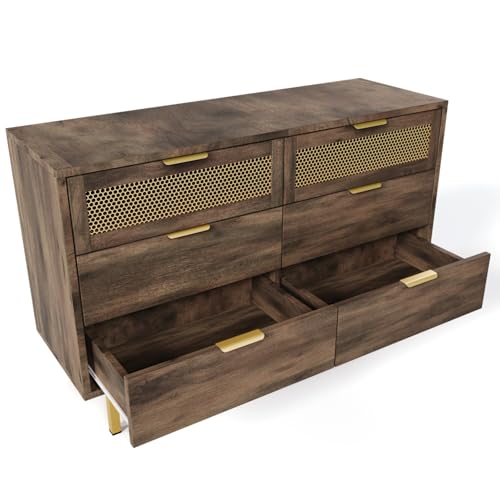 Kommode Buffet moderne à 6 tiroirs avec grille métallique aspect bois et pieds dorés Armoire de rangement élégante pour chambre à coucher et salon Organiseur chic de couloir (marron)