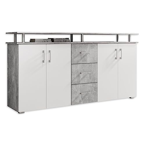 Stella Trading LIFT Highboard avec étagère en aspect béton, blanc - Armoire de salon moderne avec tiroirs et beaucoup d'espace de rangement pour votre salon - 178 x 90 x 38 cm (L/H/P)