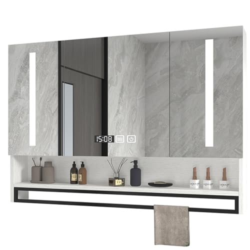 LED éclairage Salle de Bains Armoire à Pharmacie avec Miroir,3 Portes armoires de Salle de Bain avec Anti-buée Affichage de l'heure Trou pour essuie-Tout avec Miroir Interrupteur Tac(Size:120×12×70cm)