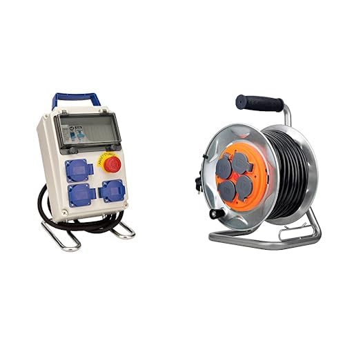 Zenitech - Coffret de Chantier IP54 8 Modules Équipé avec Arrêt D’Urgence + Enrouleur de Chantier IP44 4 Prises 16A 25 m - Alimentation Sécurisée pour Travaux et Chantiers - Gris et Orange