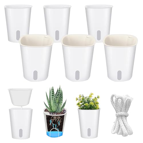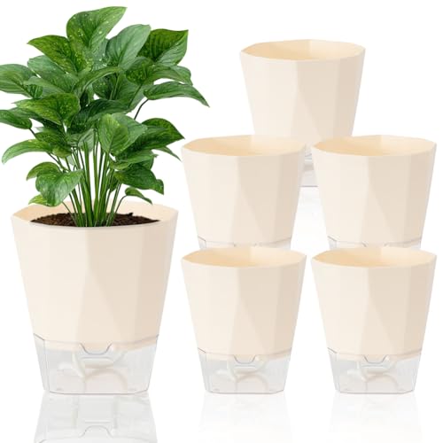 FARYODI Lot de 6 pots de fleurs, à arrosage, 12,5 cm, avec système d'irrigation, aspect ivoire, auto-arrosage, avec réservoir d'eau transparent, pour balcon et intérieur, ivoire