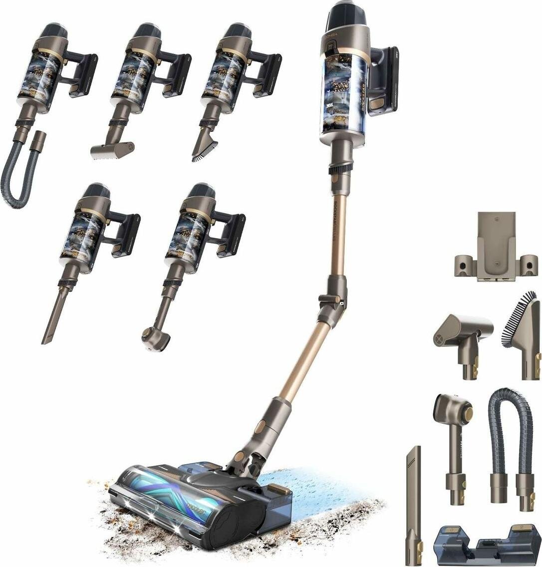 Aspirateur balai avec station de vidage automatique. 310 AW et 850 W. Tube d'aspiration flexible. Intelligence artificielle et compteur de particules. Application. Brosse pour animaux et accessoire de lavage avec réservoir d'eau.