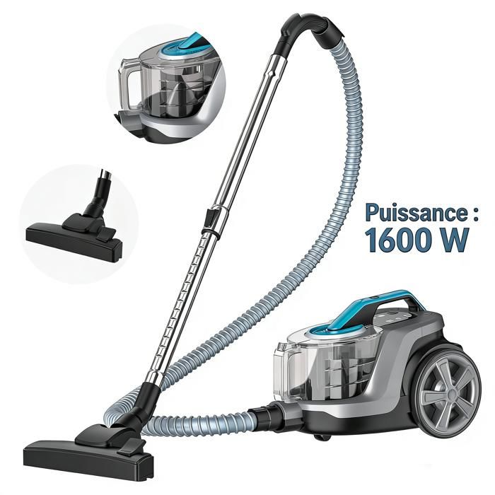 Aspirateur sans sac 2600W puissant 1.5L – Silencieux multifonction câble 5m compact nettoyage sol/tapis/canapé design léger