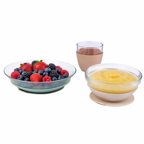 BÉABA & Duralex, Coffret Repas Enfant en Verre, Assiette, Bol, Verre avec Ventouse Silicone, Ergonomique, Evolutif, Sain, Durable, Made in France, Natural