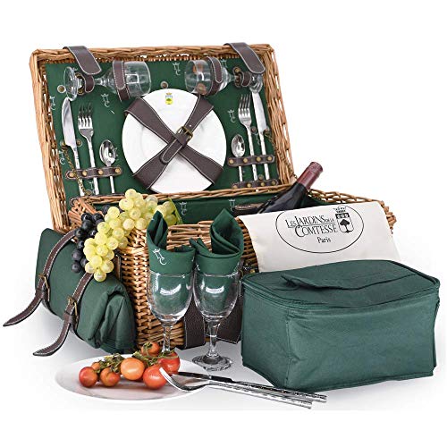 Les Jardins de la Comtesse - Panier Picnic Champs Elysées Vert en Osier - Sangles en Cuir - Complet 4 Personnes - Glacière/Nappe - Assiettes en Porcelaine et Verres à Vin en Verre - 57 x 37 x 23 cm