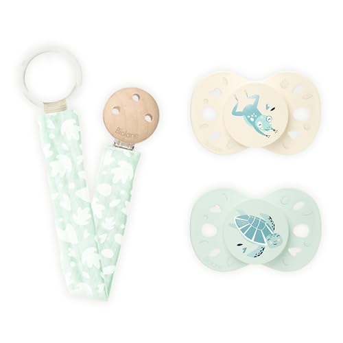 BIOLANE- Lot de 2 Tétines Anatomiques et Attache Tétine Verte- Verte et Beige - 0 à 6 mois - Animaux - Téterelle réversible - Tissu 100% coton-Confort Optimal -Respect du développement bucco-dentaire