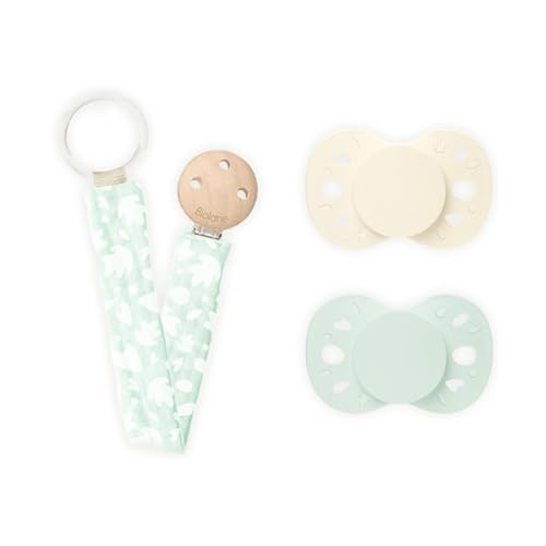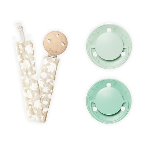 BIOLANE - Lot de 2 Tétines Anatomiques et Attache Tétine Verte - Verte et Beige - 6 à 18 mois - Téterelle réversible - Tissu 100% coton - Confort Optimal - Respect du développement bucco-dentaire