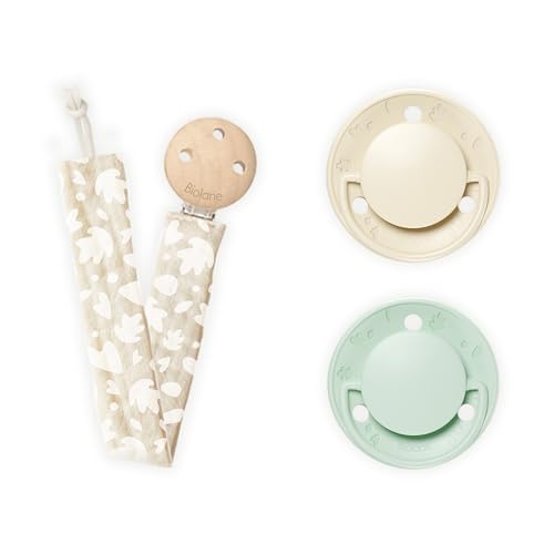 BIOLANE - Lot de 2 Tétines Rondes et Attache Tétine Beige - 0 à 6 mois - Sucettes extra-fines Verte et Beige - Tissu 100% Coton - Douces et Confortables - Respect du développement bucco-dentaire